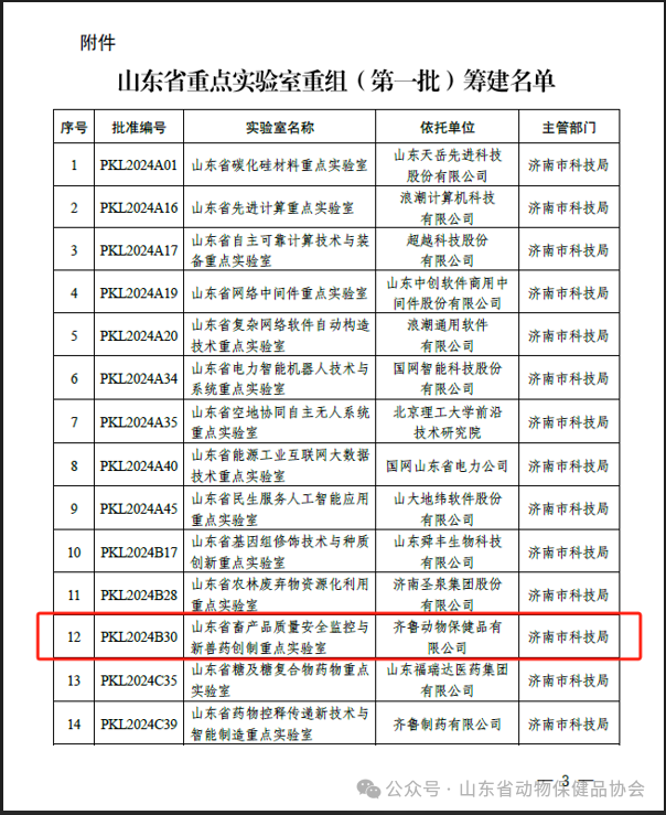 热烈祝贺山东省动物保健品协会会长单位齐鲁动物保健品有限公司获批筹建山东省重点实验室!近日,山东省科学技术厅发布《关于批准山东省重点实验室(第一批)筹建的通知》(鲁科字〔2024〕68号),齐鲁动物保健品有限公司作为牵头单位申报的“山东省畜产品质量安全监控与新兽药创制重点实验室”,以其雄厚的科研实力和强大的创新能力获批筹建。